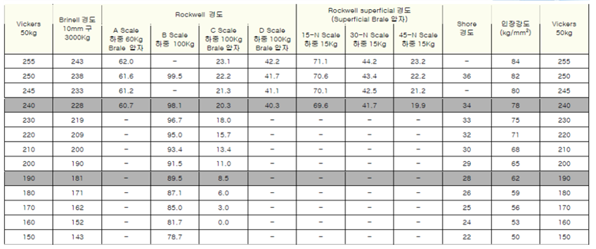 | 비커스 경도 | 브리넬 경도 환산값 | 로크웰 경도 환산값 | |